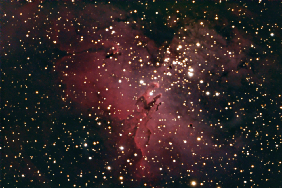 The Eagle nebula is a emission nebula and open star cluster. It contains those famous Hubble Space Telescope images of the "Pillars Of Creation", which are columns of cool hydrogen gas and dust protruding from a molecular cloud. New stars are being formed in these clouds.