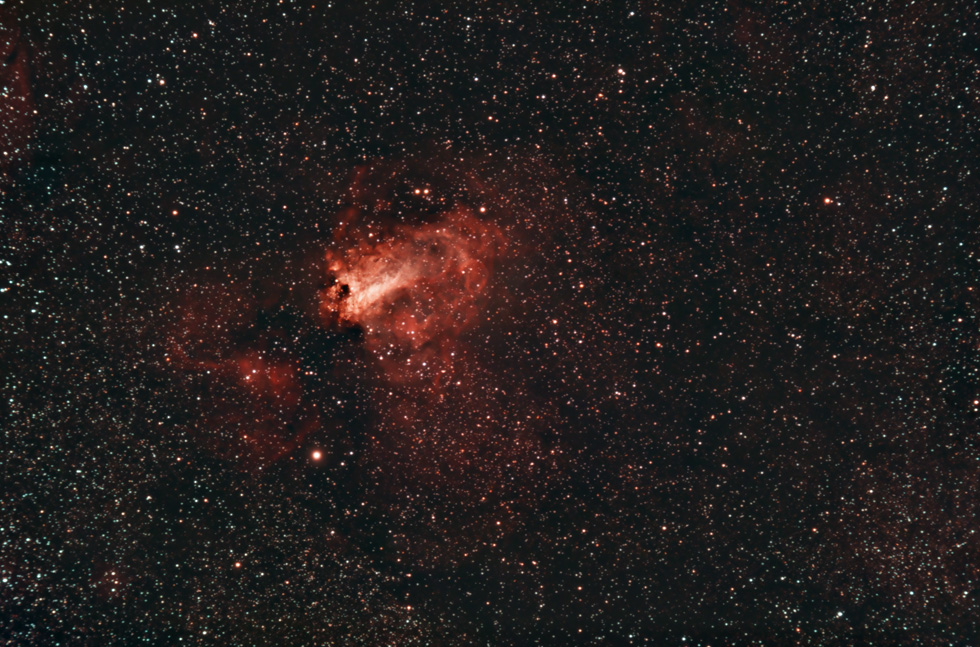 Name: Swan or Omega Nebula - M17 / NGC6618 M17, is much like M42, an active star forming region. In a small area west of of the swan's neck, a young cluster hardly one million years old with more than 8,000 to 10,000 member stars lies mostly hidden inside the nebula. The core alone contains 750 stars. These very young objects have between 5 and 20 solar masses each and nine very luminous cluster members of spectral type 0 ( > 30,000K very hot, blue stars, lines of ionized helium ) must weigh about 60 solar masses. However their light has been extinguished by 30 magnitudes of absorption by the dust within the nebula, in addition to the 1.8 magnitudes of interstellar extinction. Only five of these stars are visible. They are brighter than magnitude 14.2, two of them even brighter than 10th magnitude in visible light. The rest of this cluster can only be studied in infrared light, where the absorption by dust is less severe.